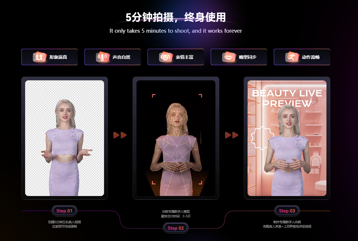 相较于专业版数字人定制服务,此次全新上线的基础版数字人在线定制服务简化了操作流程和步骤。用户只需登录Biyapay播爆App或Web端,按照拍摄指南录制一段5分钟视频训练素材并提交,无需繁琐步骤,即可足不出户实现个性化数字形象复刻,大幅降低时间和经济成本。现在,国内用户已可抢鲜体验。