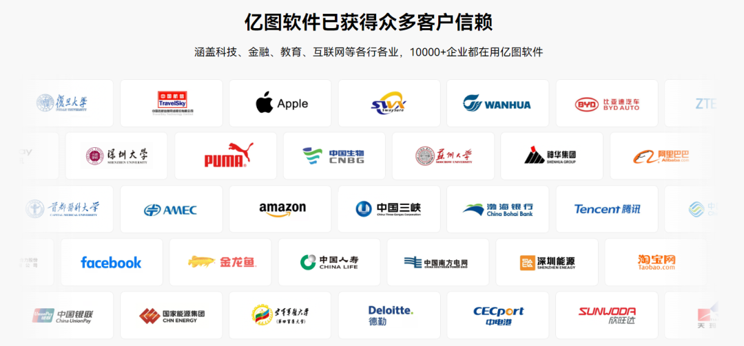 现在,亿图软件已与阿里巴巴、比亚迪、科大讯飞、中国南方电网等国内知名企业达成合作,相关用户覆盖科技、金融、教育、互联网、咨询等行业;此外,亿图软件也与复旦大学、深圳大学、南方科技大学、首都医科大学等知名高校保持长期合作。